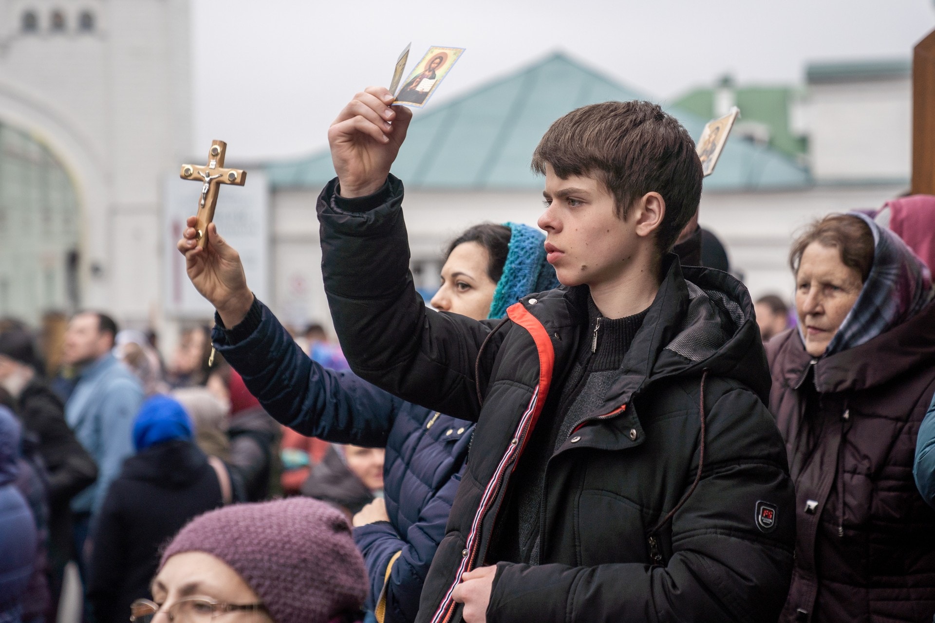 Pavlo Ferrisch, 23 anni, si è presentato con un poster fuori dal monastero. Lui vuole Non hanno questi monaci a Kiev.
